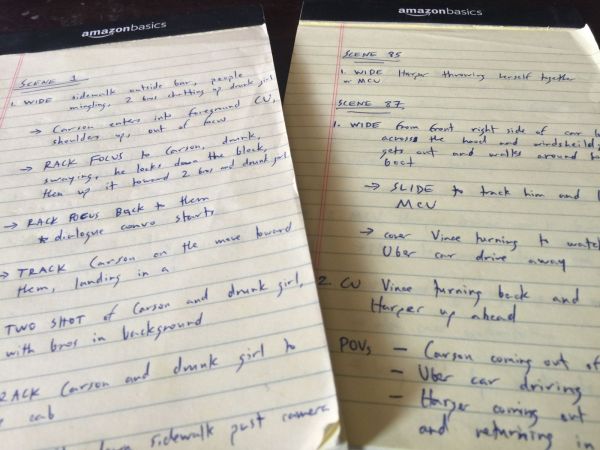 I finished the first draft of my shot lists yesterday. This is, essentially, the movie on paper. A description in technical camera terms of the scenes that have been playing in my head for two years. It fills two small legal pads. I'm looking forward to sitting down with my cinematographer to collaborate further with him, and I'm going to find a storyboard artist to work with to turn the descriptions into pictures, which will support us a lot on set. You can get a sneak peek of Scenes 1, 84 and 85 in the picture below... :)